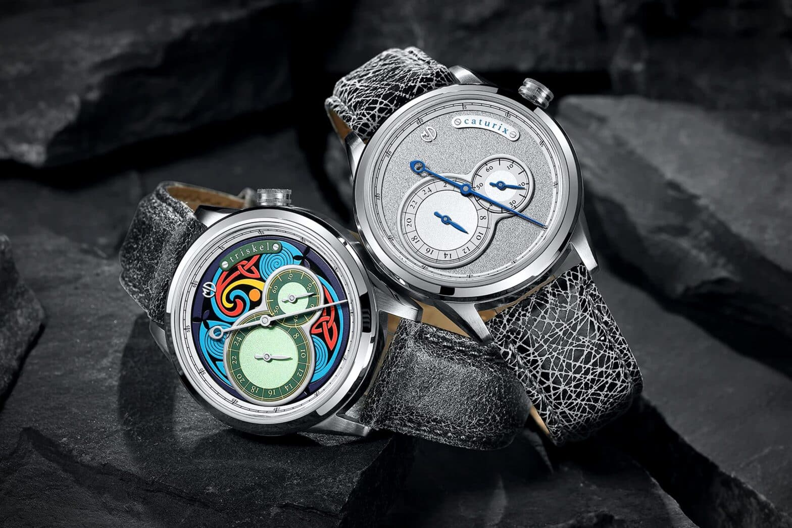 El primero, el más sobrio, es bautizado Caturix, según el nombre del Dios de la Guerra (equivalente del Marte romano o del Toutatis galo). Su acabado plateado texturizado permite capturar y reflejar la luz, «como las estrellas en el cielo». El segundo, Triskel, presenta un dial multicolor que reinventa el símbolo celta por excelencia, con sus tres espirales rediseñadas libremente. El éxito de la campaña en Kickstarter también debería permitir a MD Watches Studio ofrecer nuevas variantes de diales en colores vibrantes: Alaunus (rosa), Ogmios (azul), Taranis y Tonaros (naranja).